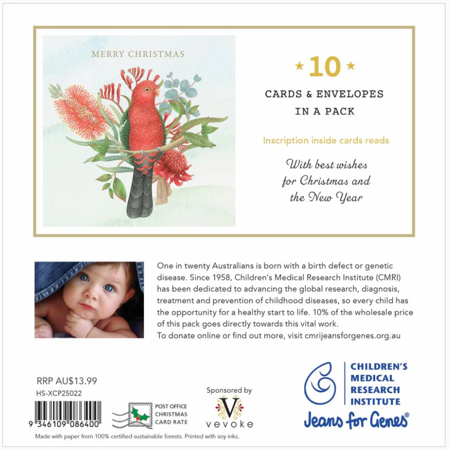 This Charity Christmas pack of 10 King Parrot cards is not only beautifully illustrated by Melbourne artist Sarah Hardy but your purchase ensures 10% of wholesale proceeds continue to be donated to the Children's Medical Research Institute.